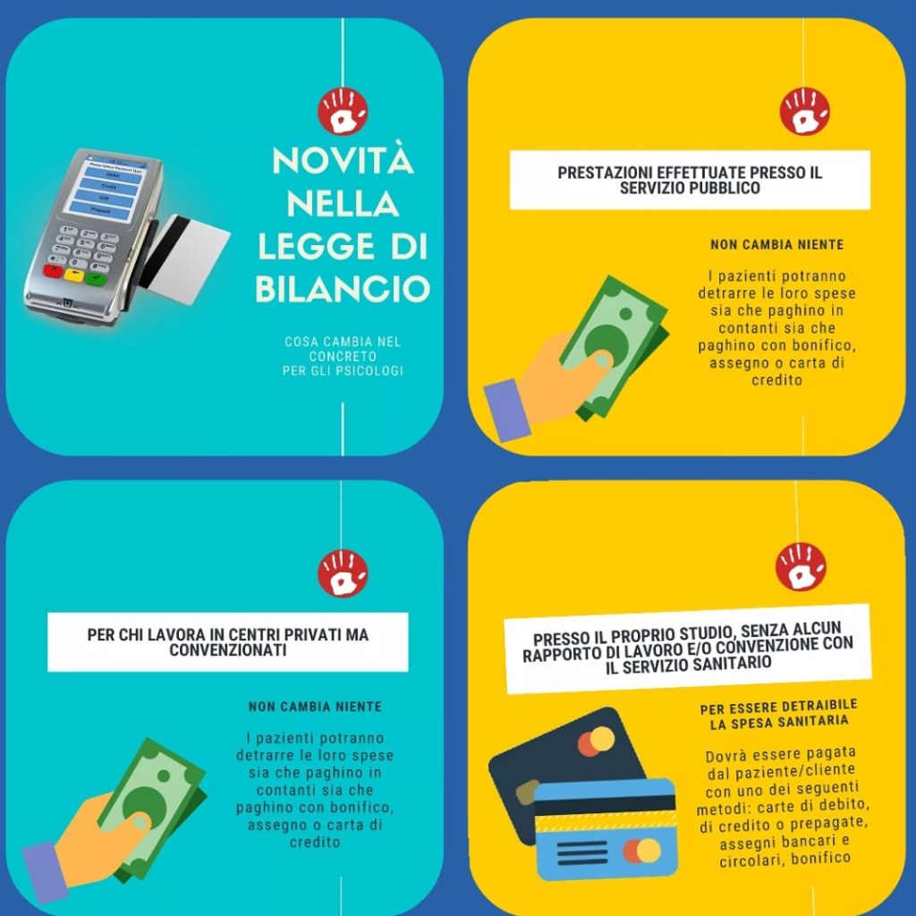 Ogni forma di pagamento ha i suoi pro e contro, tuttavia il vero inconveniente lo subisce il cliente che non può più avvalersi del pagamento in contanti, pena la mancata #detraibilità del 19% della spesa sanitaria sostenuta. Sperando di aver fatto un po’ di chiarezza ti saluto augurandoti un sereno #2020. Si ringrazia Altra Psicologia per le immagini.